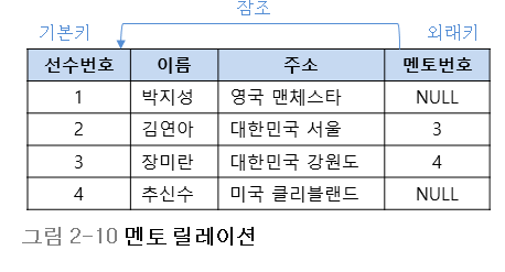 외래키 - 다른테이블이나 같은테이블(멘토의 경우)에서 참조하는 키