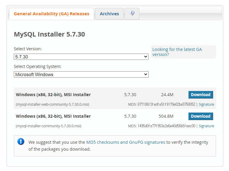 Select Operating System: Select Operating System… Microsoft Windows Select OS Version: All Windows (x86, 32-bit) Windows (x86, 32-bit), MSI Installer 8.0.20 24.4M (mysql-installer-web-community-8.0.20.0.msi) MD5: 26ae47807122bf0052b99ebf893b0dac | Signat