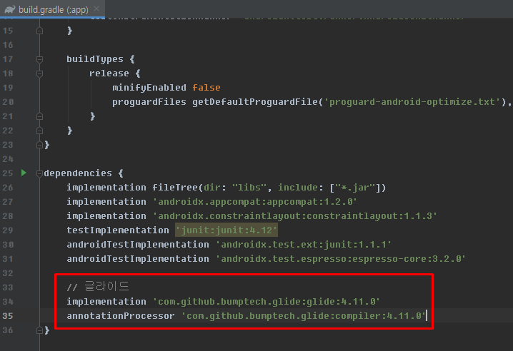 앱 수준 gradle에 글라이드 의존성추가