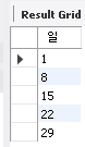 SELECT MAX(if(DAY ='일', NUM_DAY,"")) "일" FROM sakila.cal WHERE week LIKE '1';