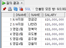 SELECT DEPT2.DNAME, EMP2.NAME, TO_CHAR(EMP2.PAY, '$999,999,999') SALARY