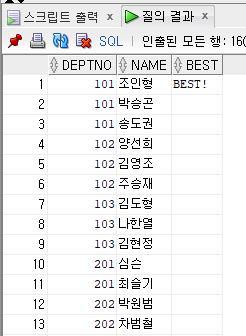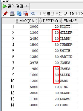 DEPTNO를 그룹으로 만들었으나 ENAME가 양이 더 많기때문에 중복으로 나타남
