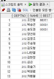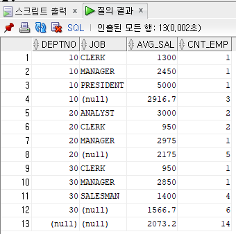 SELECT DEPTNO, JOB, ROUND(AVG(SAL),1) AVG_SAL, COUNT(*) CNT_EMP