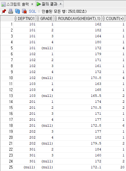 SELECT DEPTNO1, GRADE, ROUND(AVG(HEIGHT), 1) , COUNT(*)