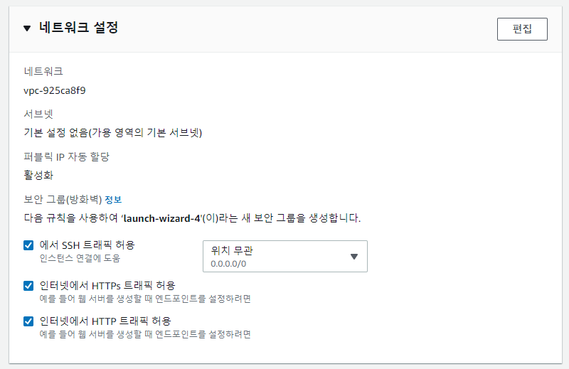 SSH 트래픽허용 / HTTPS 트래픽 허용 / HTTP 트래픽 허용을 선택해주자.(22 / 443 / 80 인바운드 포트가 열린다.)