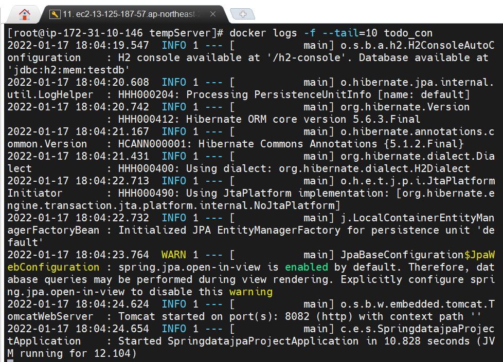 접속이 된 것을 확인할 수 있으며 도커파일의 WORKDIR로 시작하는 것을 볼 수 있다.