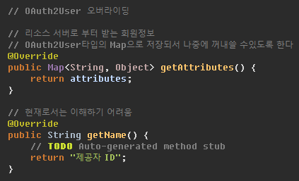 OAuth2User를 임플리먼트 면 두개의 메서드를 오버라이딩 해야한다