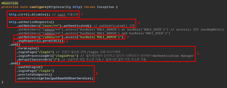 6. OAuth로그인시 설정 userInfoEndpoint() - OAuth2 로그인 성공 후 사용자 정보를 가져올 때의 설정들을 담당 userService(principalOauth2UserService) 소셜 로그인 성공 시 후속조치를 시행할 UserService 인터페이스의 구현체를 등록