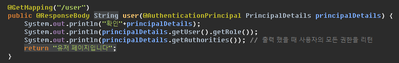 @AuthenticationPrincipal // UserDetailsService에서 Return한 객체 를 파라메터로 직접 받아 사용할 수 있다