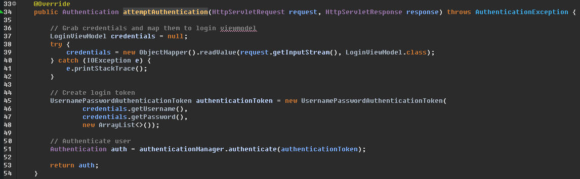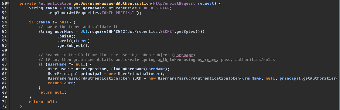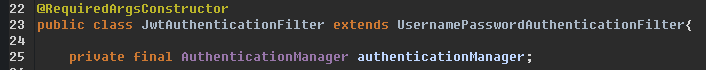 JwtAuthenticationFilter : Form Login시 걸리는 Filter이다. UsernamePasswordAuthenticationFilter를 상속한 JwtAuthenticationFilter을 등록하였다. 이 필터는 HttpServletRequest에서 사용자가 Form으로 입력한 로그인 정보를 인터셉트해서 AuthenticationManager에게 Authentication 객체를 넘겨준다.