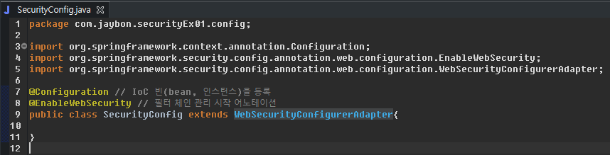@EnableWebSecurity // 필터 체인 관리 시작 어노테이션