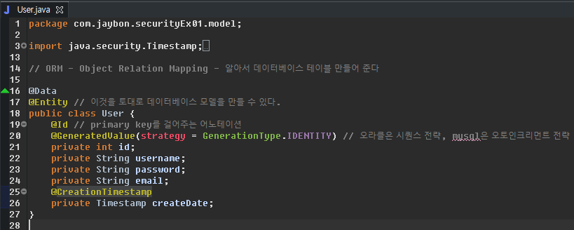 @Entity // 이것을 토대로 데이터베이스 모델을 만들 수 있다.