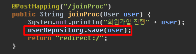 System.out.println("회원가입 진행" + user);