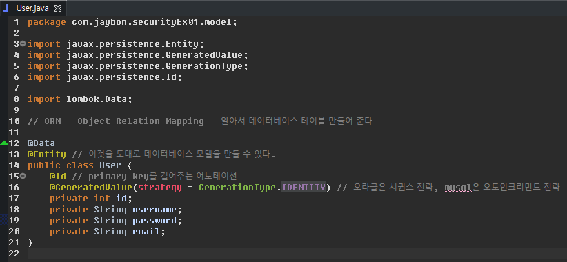 @GeneratedValue(strategy = GenerationType.IDENTITY) // 오라클은 시퀀스 전략, mysql은 오토인크리먼트 전략